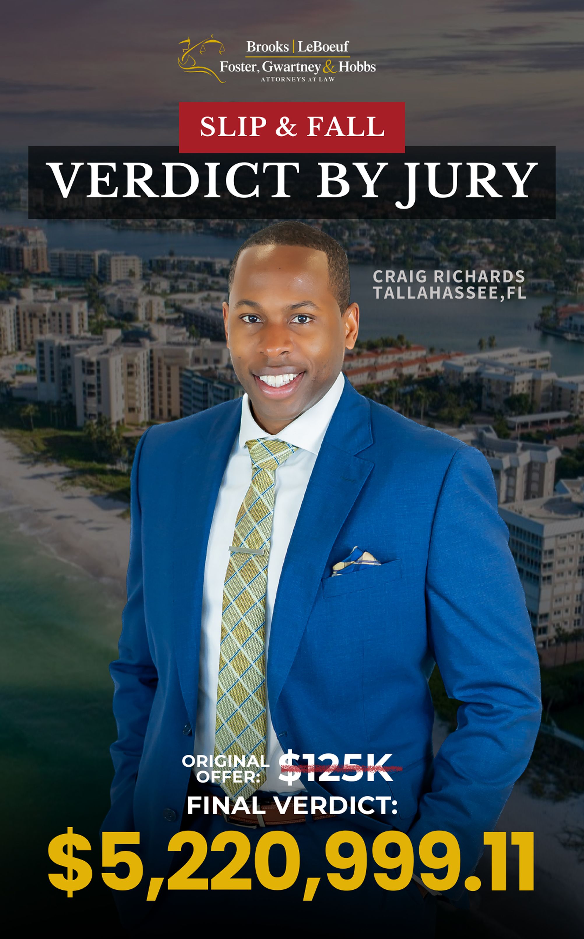 Craig Richards is a trial-tested personal injury attorney who recently secured a $5,220,999.11 jury verdict in a premises liability slip-and-fall case tried in conservative Collier County, Florida. Our client, a non-invasive cardiologist, suffered a serious knee injury requiring surgery after a fall at a commercial property. The insurance company initially offered just $125,000 and later $1.1 million before trial, but Craig took the case to a jury and obtained a verdict that truly reflected the client’s medical needs, lost earning capacity, and long-term pain and limitations.